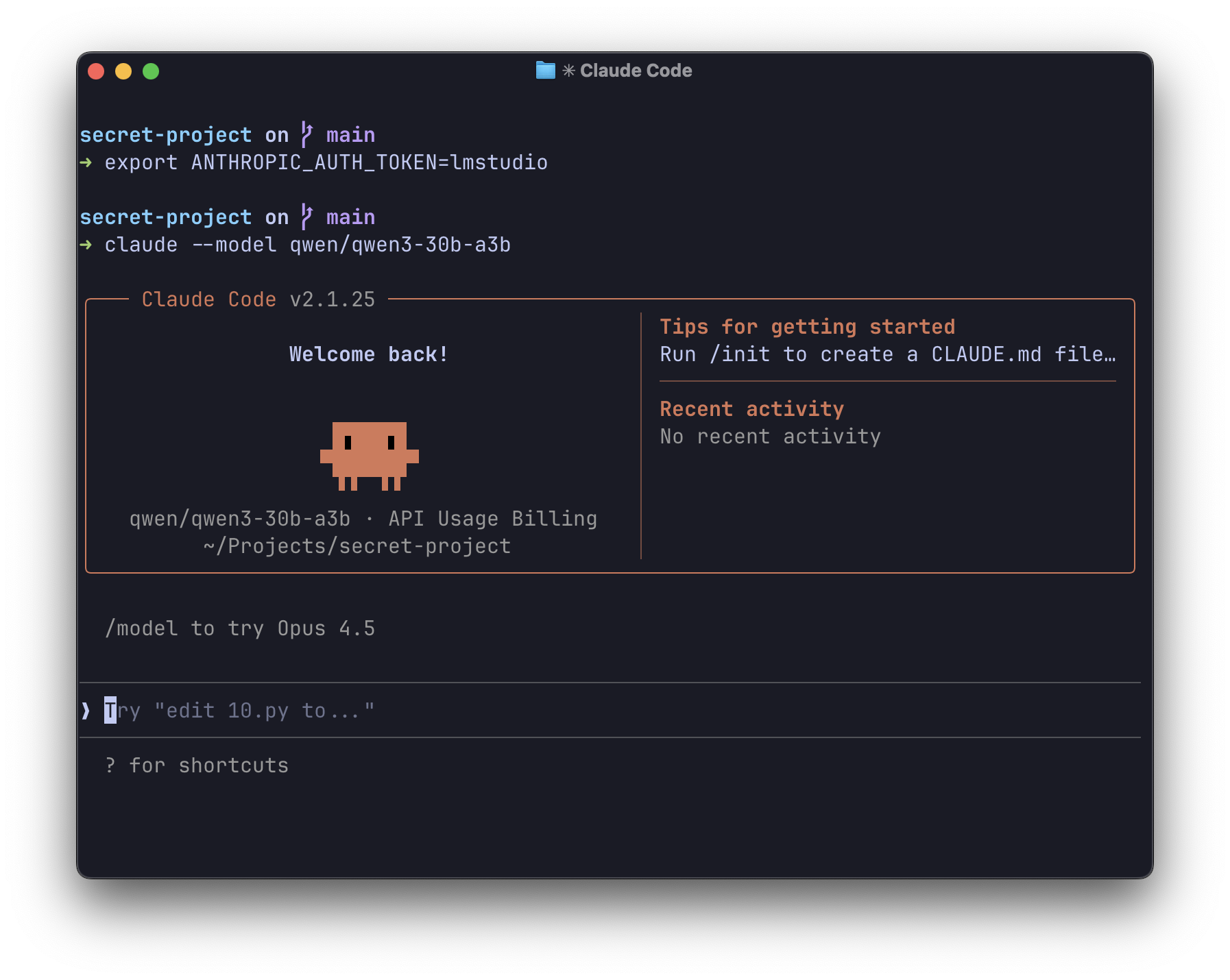 claude --model openai/gpt-oss-20bThat's it! Claude Code is now using your local model.