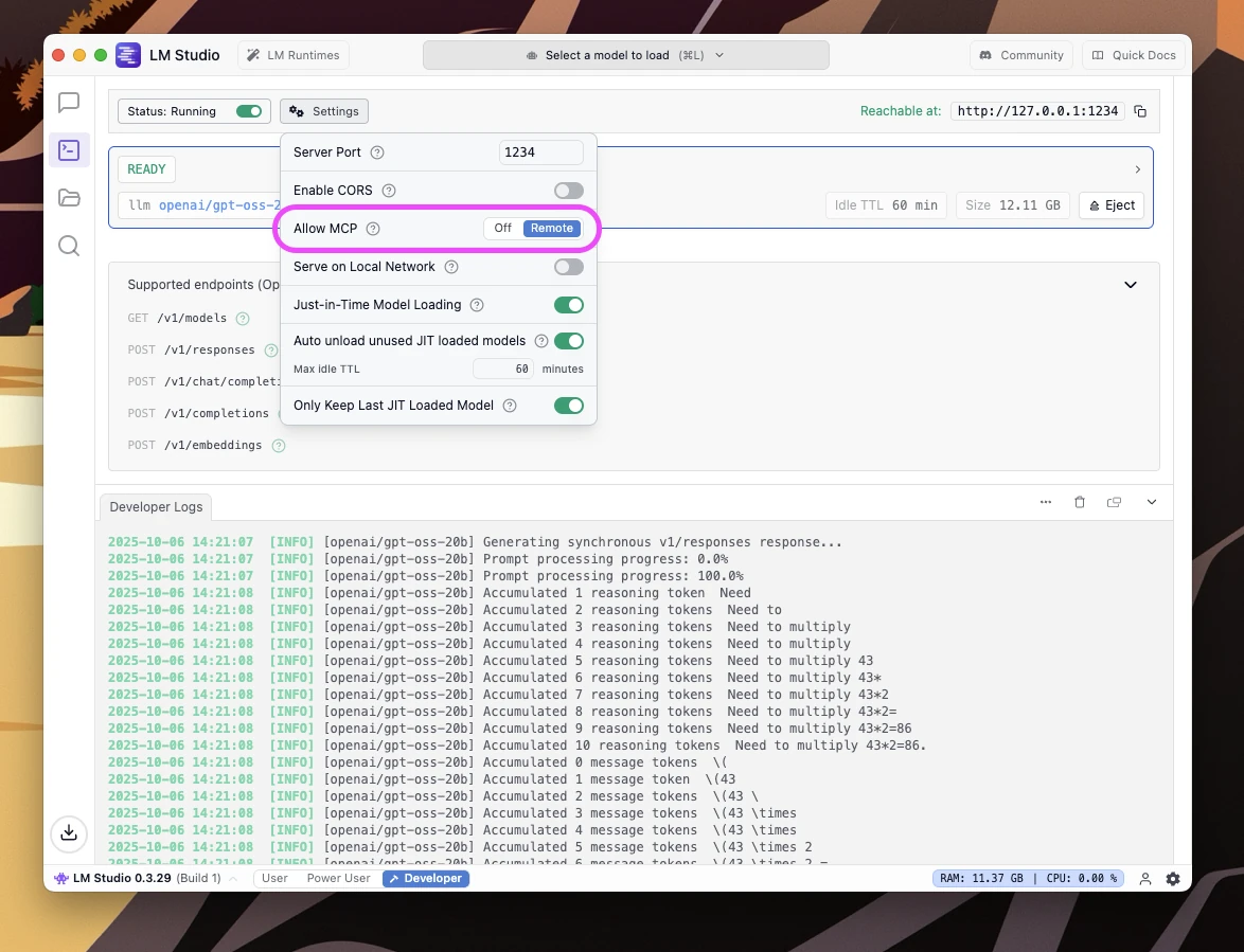 previous_response_id to continue interactions without needing to manage message history yourself.v1/chat/completions.reasoning: { effort: "low" | "medium" | "high" } for openai/gpt-oss-20b.stream: true to receive SSE events as the model generates, or omit for a single JSON response.To use REST API server endpoints, ensure your LM Studio server is running in the UI (Developer → Status: Running):