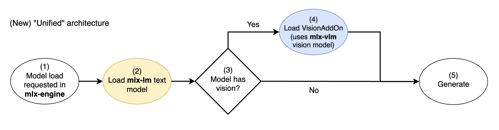 In this unified architecture, always load the core text model of a multi-modal LLM from mlx-lm (2), no longer potentially loading a slightly different text model from mlx-vlm.