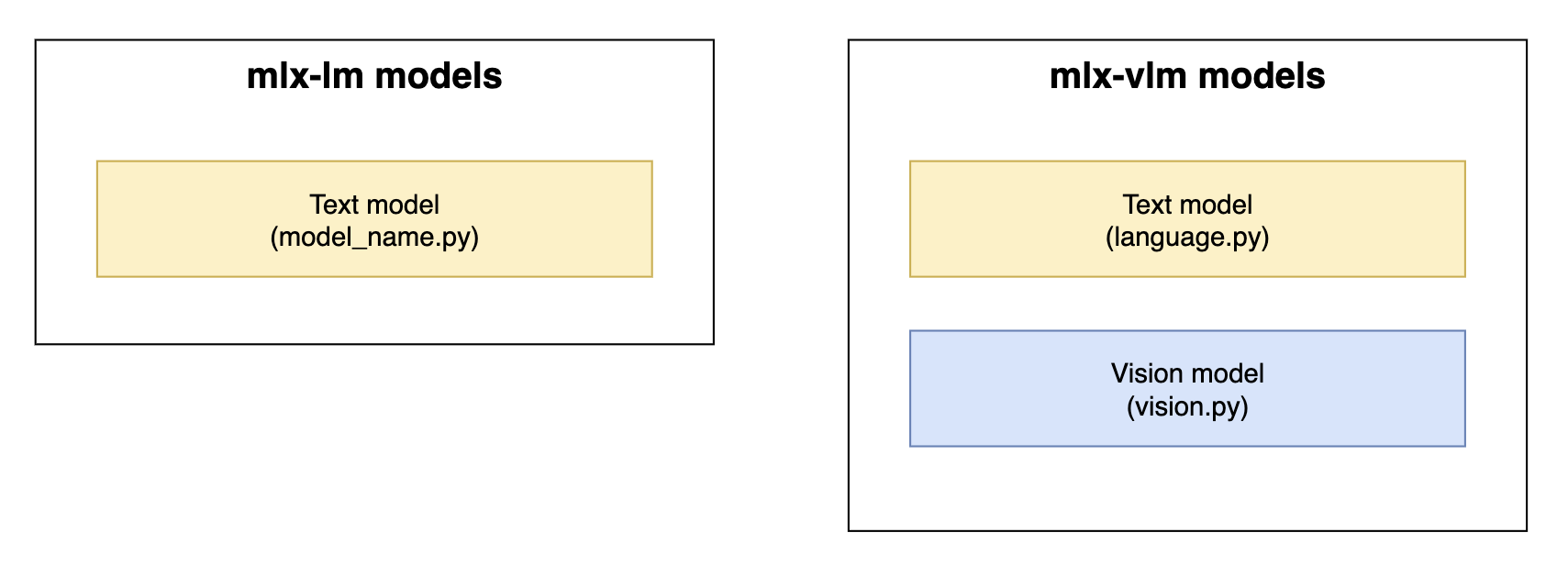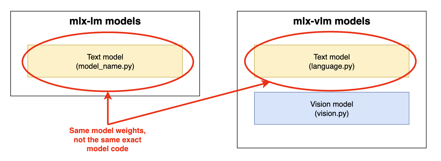 Model implementation components in mlx-lm and mlx-vlm. Yellow = text model components. Blue = vision model components