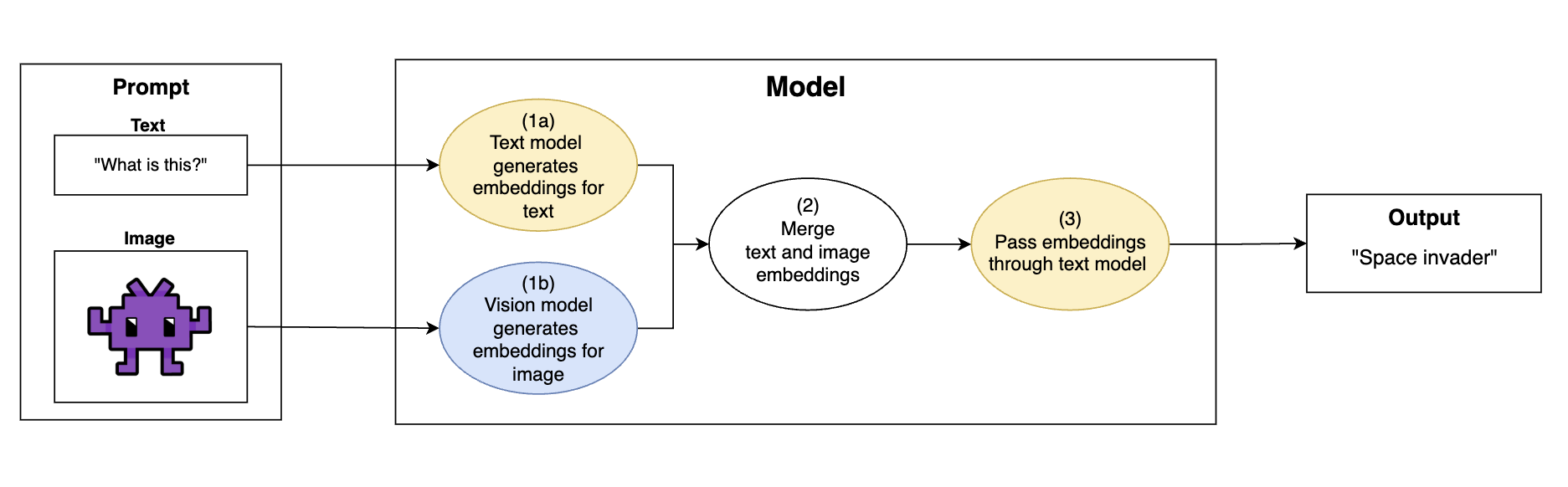 General operational flow of a multi-modal vision LLM: Convert images into embeddings that can be understood by the text model, generate output with the text model