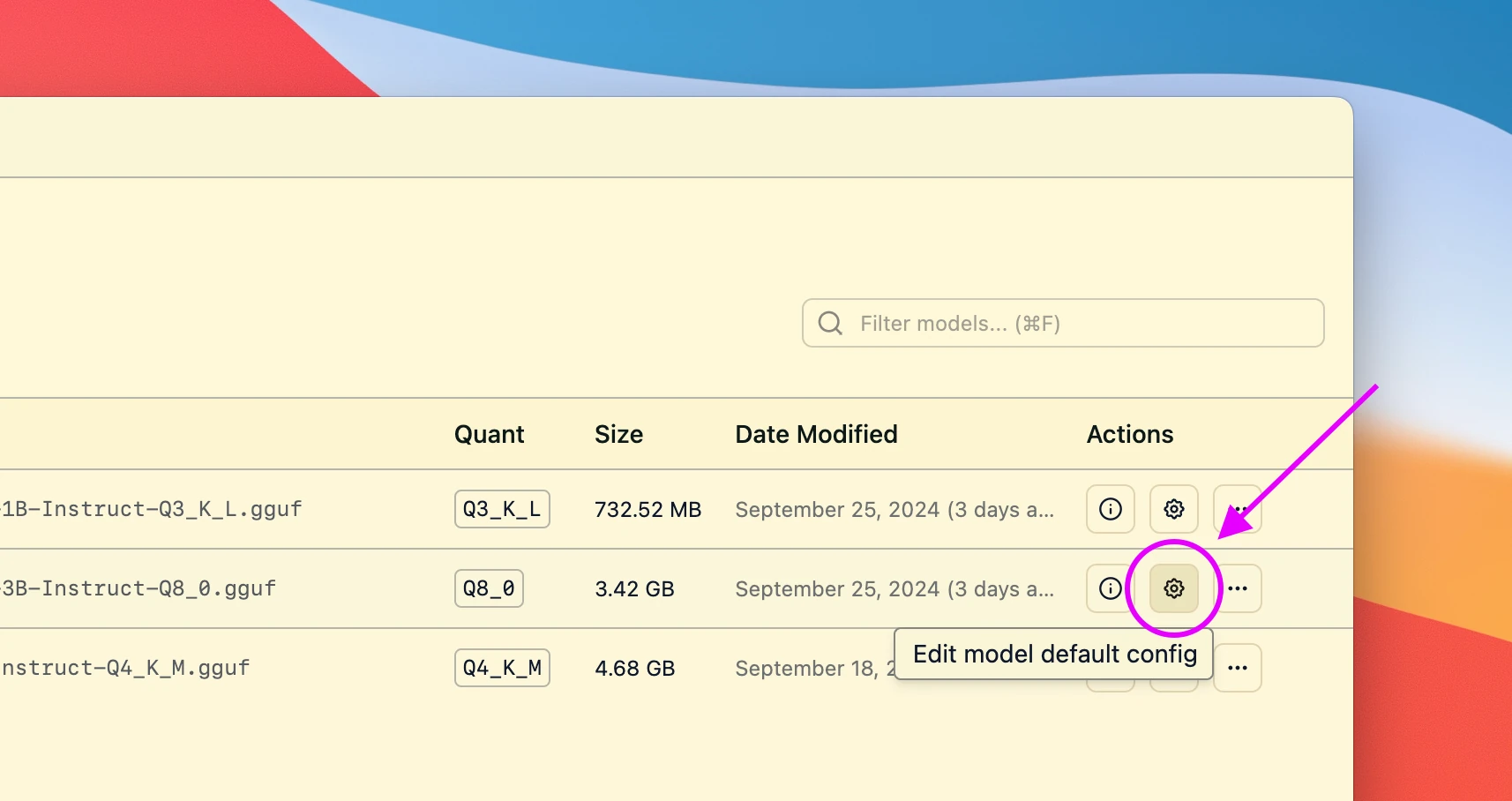 Head to the My Models tab and click on the gear ⚙️ icon to edit the model's default parameters.